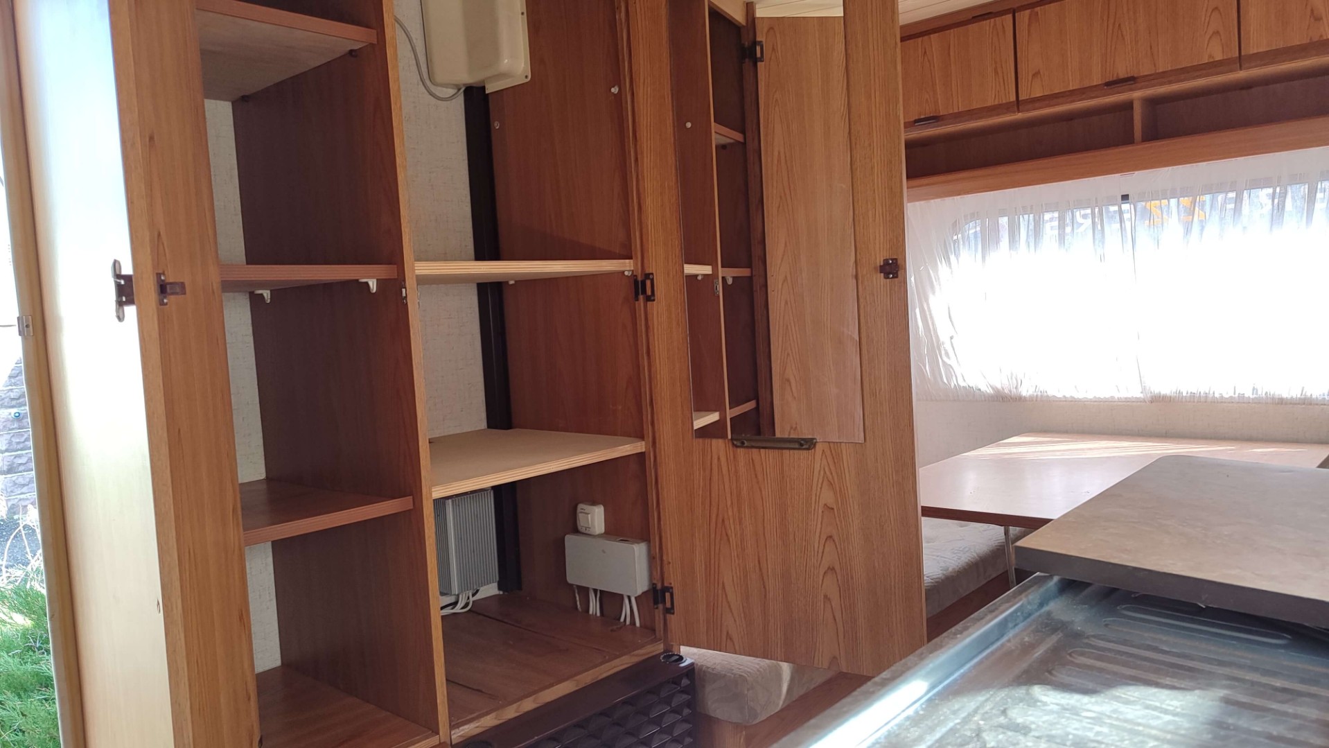 В кемпере установлена автономная аккумуляторная батарея на 12В, поддерживающая освещение и зарядку техники, что особенно важно вдали от электросети. На окна предусмотрены москитные сетки для защиты от насекомых. Для большего удобства прилагается шатер-палатка для отдыха на открытом воздухе — отличный способ спрятаться от солнца или дождя. Тепло внутри прицепа поддерживает газовый отопитель (даже при минусовых температурах).