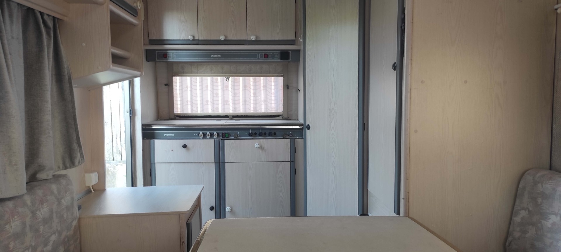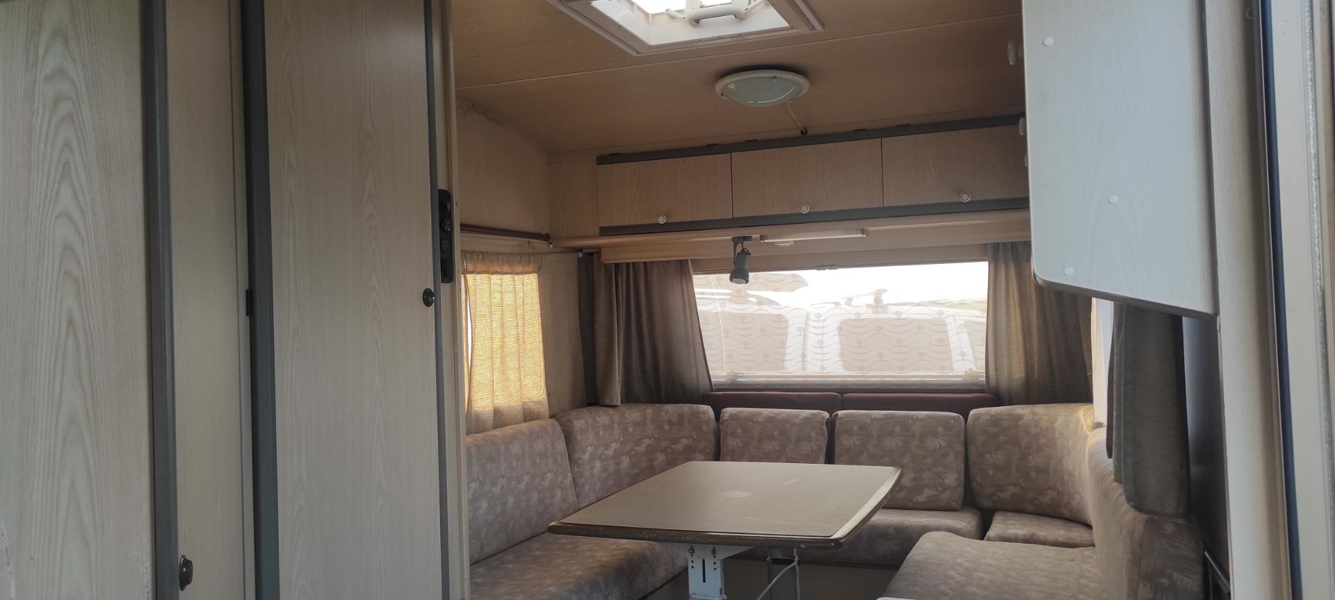 Dethleffs RT — компактный кемпер для трех взрослых, который станет надежным выбором для путешествий и отдыха на природе. При длине всего 4 метра прицеп оборудован полноценным санузлом с туалетом, умывальником и душем, что создает комфортные условия даже вдали от цивилизации. Кухонное пространство оснащено газовой плитой на три конфорки, где удобно готовить на компанию, а холодильник с питанием от газа или электросети позволяет длительное время сохранять продукты свежими.